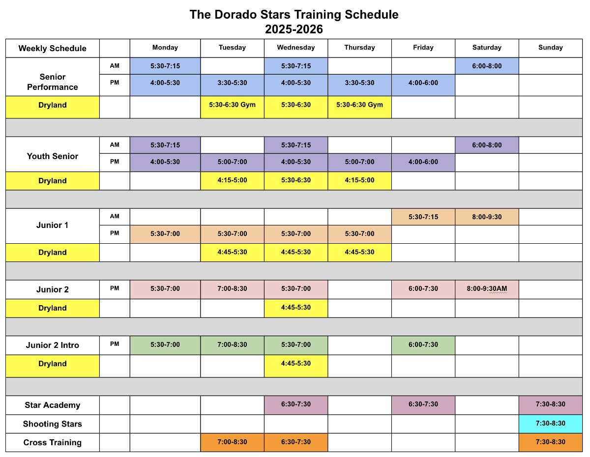 Here is the Dorado Stars 2025-2026 Training Schedule!
