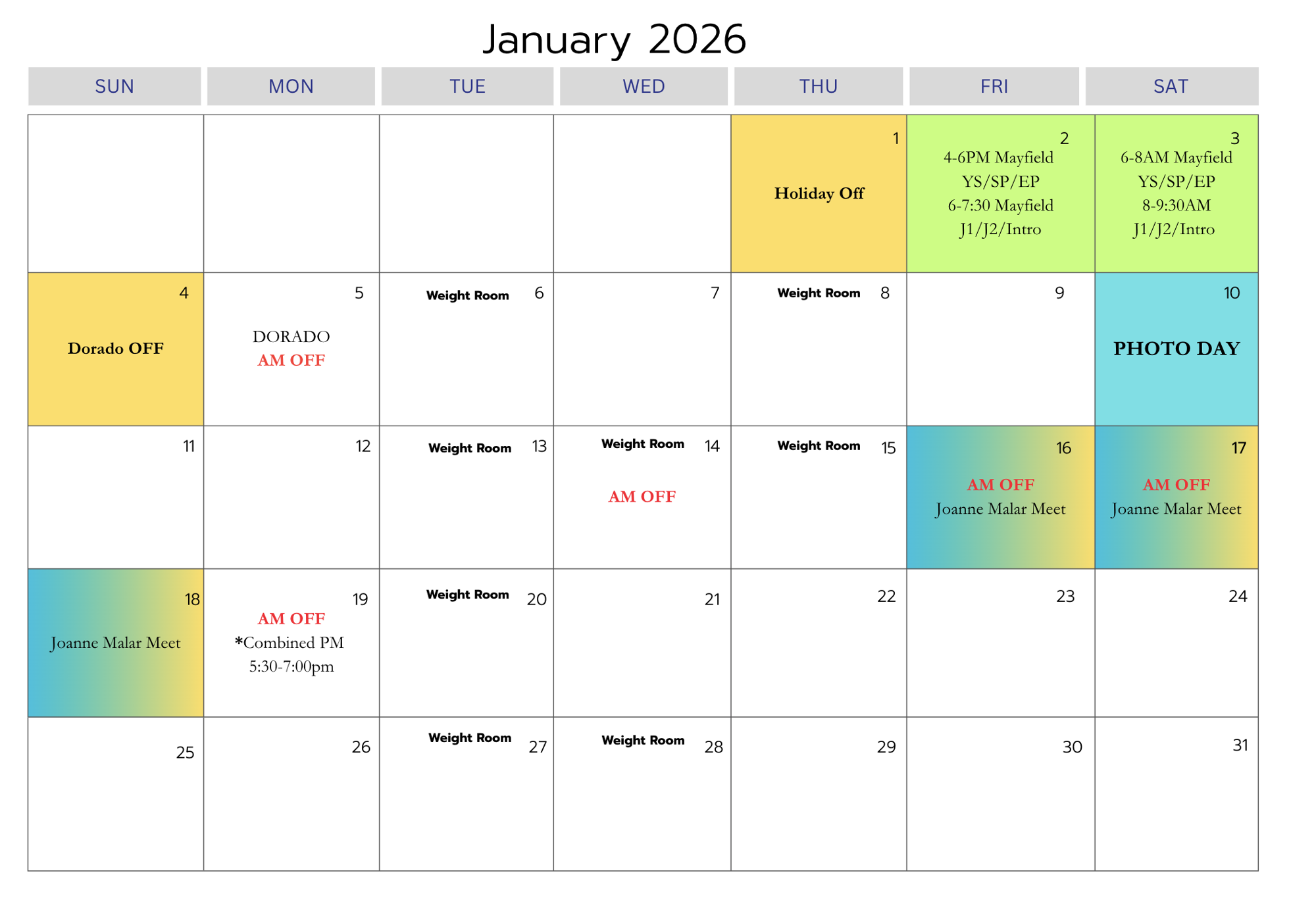 Here is our January 2026 Calendar for your reference.